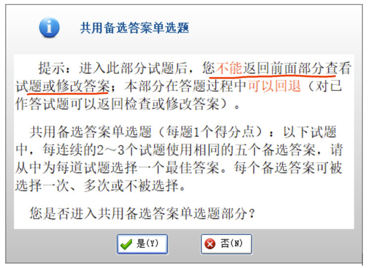 而一旦确认完成作答、进入新的题型时(如将由 A1 题型切换至 A2 题型),考生将不能退回到前一题型进行查看和修改答案。