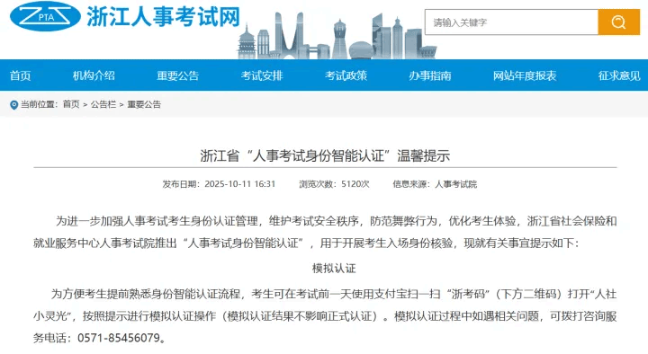为方便考生提前熟悉身份智能认证流程, 考生可在考试前一天使用支付宝扫一扫“浙考码”(下方二维码)打开“人社小灵光”,按照提示进行模拟认证操作(模拟认证结果不影响正式认证)。模拟认证过程中如遇相关问题,可拨打咨询服务电话:0571-85456079。