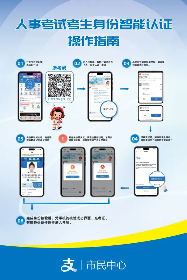 (1)考试当天,请于每科目(场次)开考前1小时到达考点, 在考点(考场)入口处使用支付宝扫一扫张贴的“浙考码”完成身份认证。