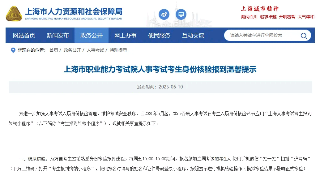 为进一步加强人事考试入场身份核验管理,维护考试安全秩序,自2025年6月起,本市各项人事考试在考生入场身份核验环节全面应用“上海人事考试考生报到终端小程序”(以下简称“考生报到终端小程序”),现就相关事宜提示如下: