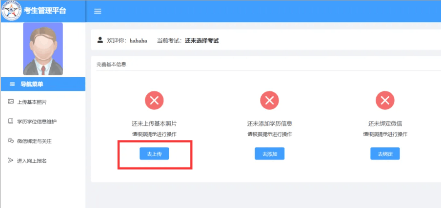(1)点击下图红框中的“去上传”或左侧导航菜单中“上传基本照片”,进入上传基本照片页面。