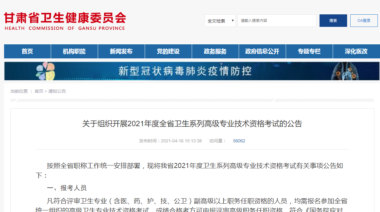 甘肃省卫生健康委员会发出关于2021年省直卫生系列高级职称专业技术资格考试的通知!