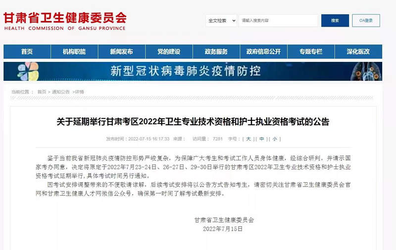 鉴于当前我省新冠肺炎疫情防控形势严峻复杂,为保障广大考生和考试工作人员身体健康,经综合研判,并请示国家考办同意,决定将原定于2022年7月23-24日、26-27日、29-30日举行的甘肃考区2022年卫生专业技术资格和护士执业资格考试延期举行,具体考试时间另行通知。